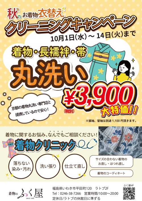 ふく屋では、秋の衣替えにあわせて クリーニングキャンペーン を開催いたします。