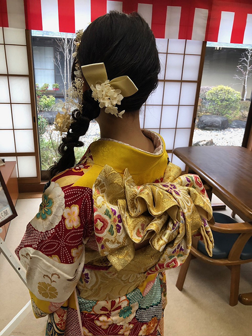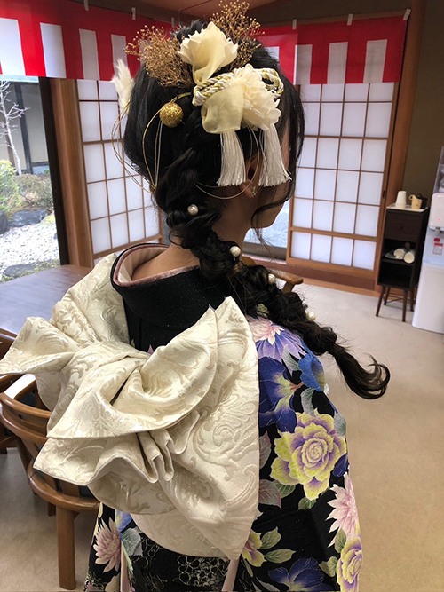 前撮りや式当日は、プロの美容師が担当。 お選びいただいた振袖と髪飾りに合わせ、お嬢様の髪質や輪郭を考慮しながら、最も美しく見えるバランスで仕上げます。「自分に何が似合うかわからない」という方も、プロのアドバイスで必ず最高の仕上がりになります。