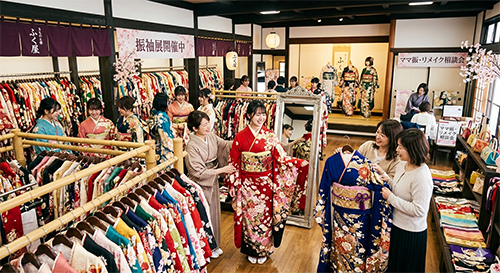 ふく屋は、いわきで130年続く老舗呉服店です。ただ数が多いだけでなく、一枚一枚の「質」にこだわっています。京都の老舗メーカーから直接仕入れることで、高品質な振袖を適切な価格でご提供できるのも、長年の信頼関係があるからこそ。一生に一度の成人式だからこそ、写真映えはもちろん、実際に触れた時の質感や着心地の良さを体感してください。